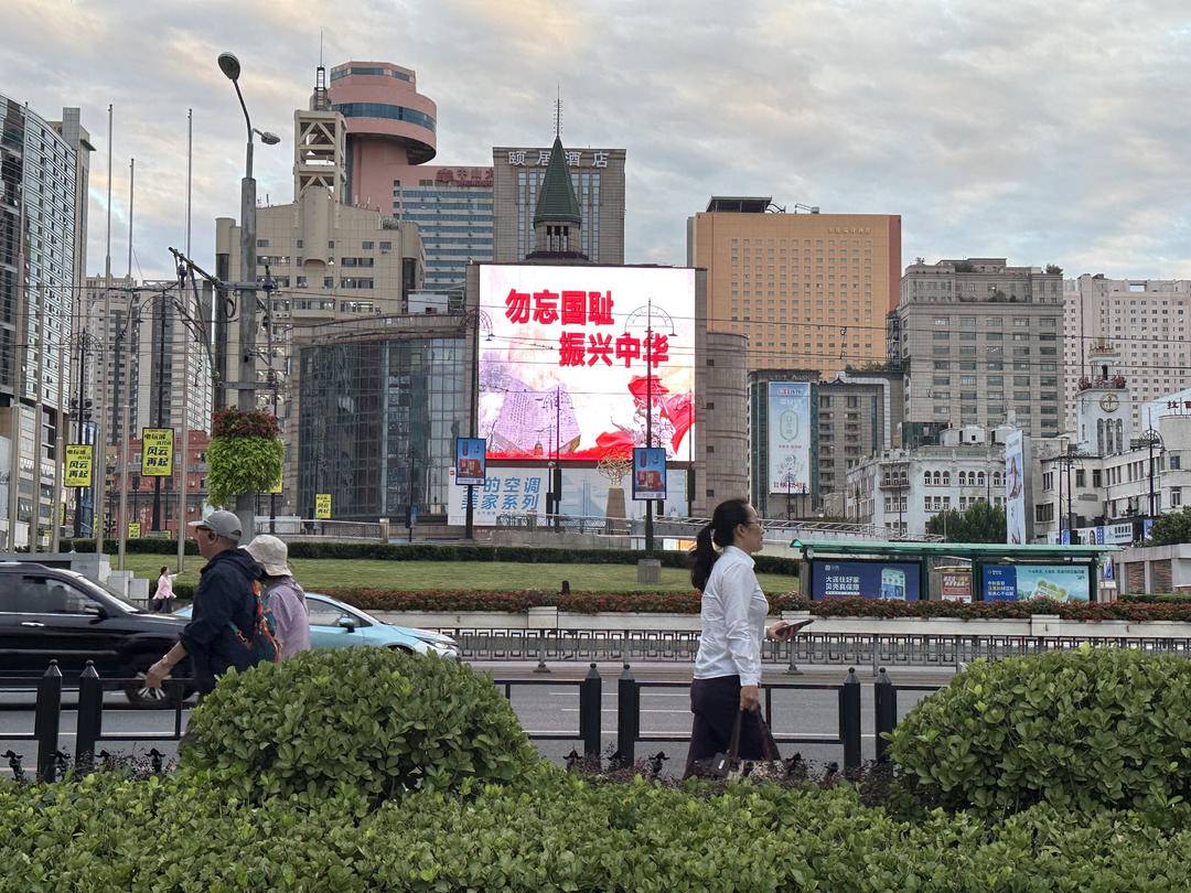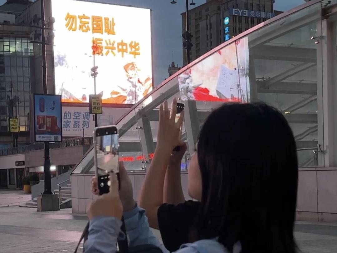 在大连的中山区青泥洼桥商圈,胜利广场两处高19米、宽17米的LED大屏在18时点亮了“勿忘国耻 振兴中华”的巨幅海报。路过的市民、刚下火车走出火车站的旅客纷纷观看,有的还举起手机拍摄留念。大连市民顾晓晨:“正好是下班路过这儿,看到纪念九一八的内容,感觉不仅仅是标语,更像是警钟在我们耳边敲响,也让我感受到现在的美好生活确实来之不易。我们要把‘铭记’转化为做好本职工作的动力,也希望能为国家的繁荣昌盛贡献自己的一份力量。”
