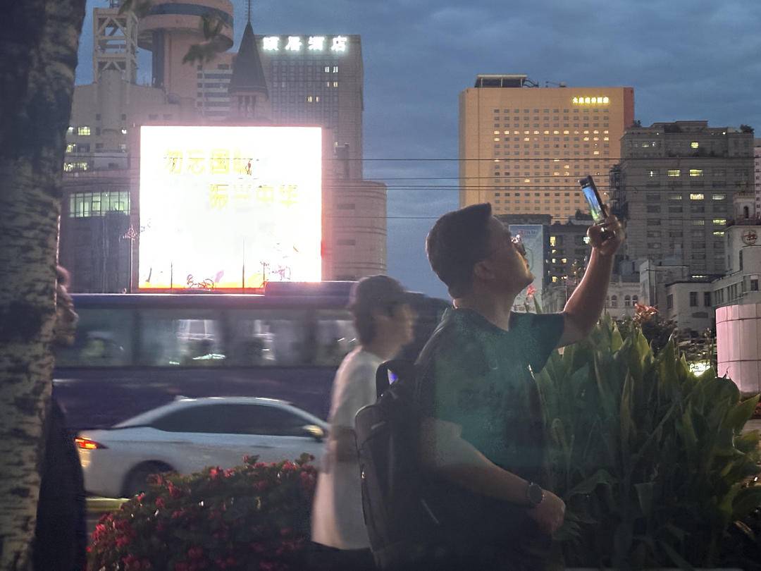 路过市民举起手机拍摄大屏幕上的勿忘“九一八”海报。