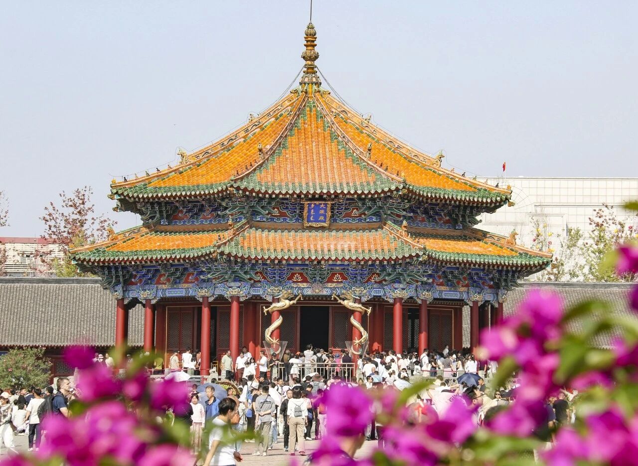 十月二日, 沈阳故宫迎来客流高峰,众多市民游客在故宫内赏花观景、拍照打卡,欢度假期。