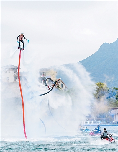 广东省广州市增城区,依托废弃矿湖、温泉等资源打造的森林海旅游度假区内正在进行水上表演。