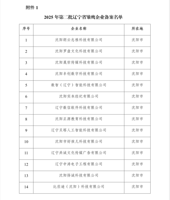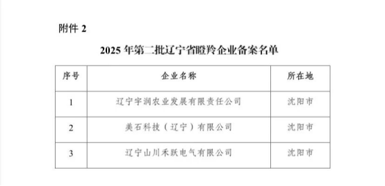 根据《辽宁省雏鹰、瞪羚、独角兽企业评价办法》,辽宁省科技厅组织开展了2025年第二批辽宁省雏鹰瞪羚独角兽企业备案工作。