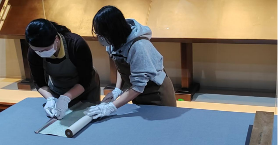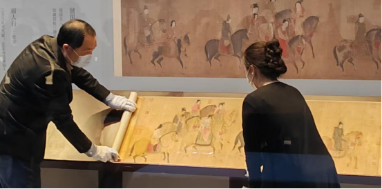 工作人员打开《虢国夫人游春图》卷轴。