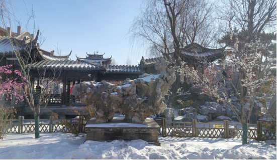 冬日千山大观园,青瓦覆白,碧湖凝冰,冰雪并未掩盖人间的勃勃生机。游园的宾客们,纷纷更换上红色传统汉服,踏雪寻梅,凭栏观雪,冰桥鉴影,那一抹鲜明热烈与白茫茫的雪境融汇,演绎了冬日独有的别样意趣。