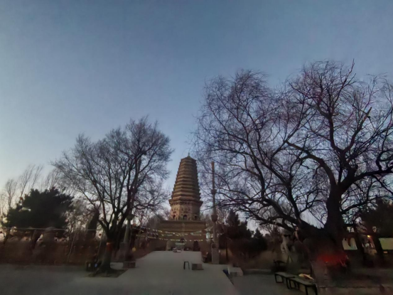 辽塔,古木环抱。