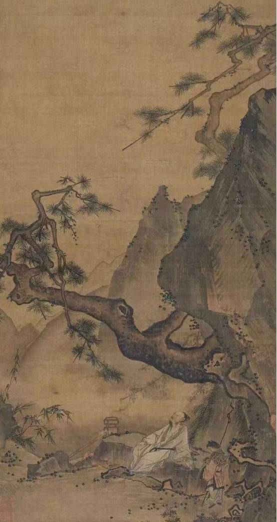 《松寿图》描绘山崖一角,苍松斜伸,临溪疏竹丛生,远山寥寥而成,一文人闲坐石台之上,仰目远眺,旁侧一童子持杖侍立,表达了如松柏之寿,如嵩山之禄的寓意。