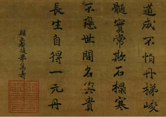 宋宁宗所题七言诗为:“道成不怕丹梯峻,髓实常欺石榻寒。不恋世间名与贵,长生自得一元丹。”落款“赐王都提举为寿”,说明此图是为王都提举这位官员祝寿而作。