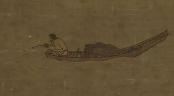 该图采用平视角度,仅描绘一叶扁舟,一位独钓渔翁,几道淡淡水纹,笔墨精练爽利,画面“虚实相生,无画处皆成妙境”。通过计白当黑的巧妙处理,以少许胜繁复的高明手段,创造出烟波浩渺的江水意境,表现了江天空旷、寒意萧索的气氛,渔翁专心垂钓的神态,给人深远的心灵感受。