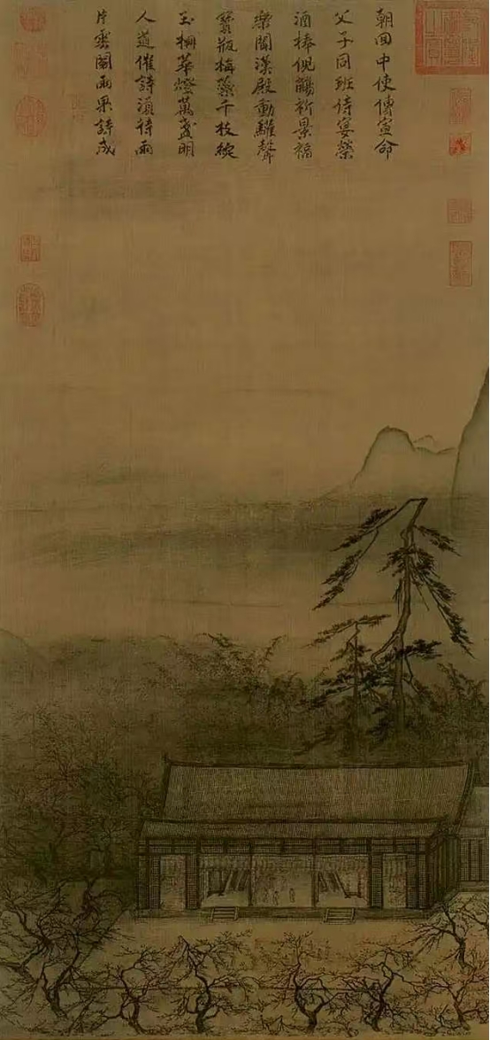 在《华灯侍宴图》这件代表作中,马远别出心裁,让观画者从户外的角度,窥见宫殿中人物活动,并借摇曳生姿的树木、墨色浓淡表现出雾色变化,烘托宫廷夜宴的欢庆氛围。画家虽没有让帝王直接出现画面上,但杨皇后又一首题诗:“朝回中使传宣命,父子同班侍宴荣,酒捧倪觞祈景福,乐闻汉殿动驩声,宝瓶梅蕊千枝绽,玉栅华灯万盏明,人道催诗须待雨,片云阁雨果诗成。”点出画题,生动记述了杨皇后一家荣宠侍宴帝王的情景。