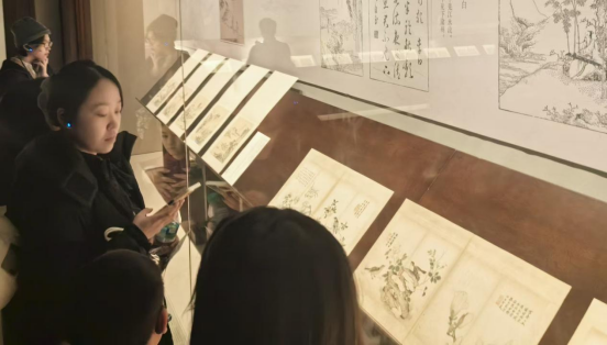 观众在辽宁省博物馆参观《芥子园画传》花鸟诗画册页。