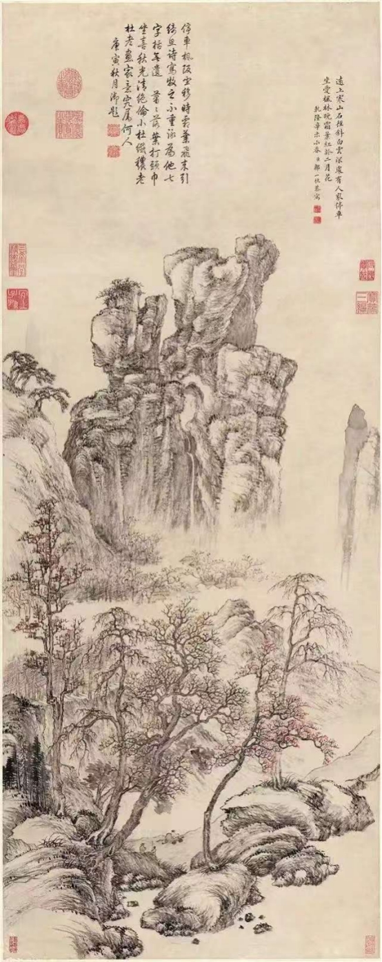 《杜牧诗意图》是清代画家邹一桂的一幅代表作,画意取自唐代诗人杜牧《山行》一诗:“远上寒山石径斜,白云生处有人家。停车坐爱枫林晚,霜叶红于二月花。”整幅画作构图巧妙,笔墨和谐,充分展现了作者深厚的绘画功底和对自然美的敏锐捕捉能力。