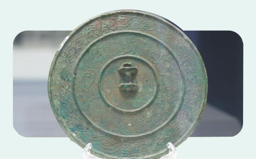 重圈六鸟纹双钮铜镜为圆形,正面平素,背面纹饰用两周较粗的凸弦纹分为内外两区。内区纹饰为单线勾勒的似大雁的六只鸟纹,形状相似,曲项长喙,如浮于水面;外区为两组平行的3条曲线,相互缠绕形成变体蛇纹图案。