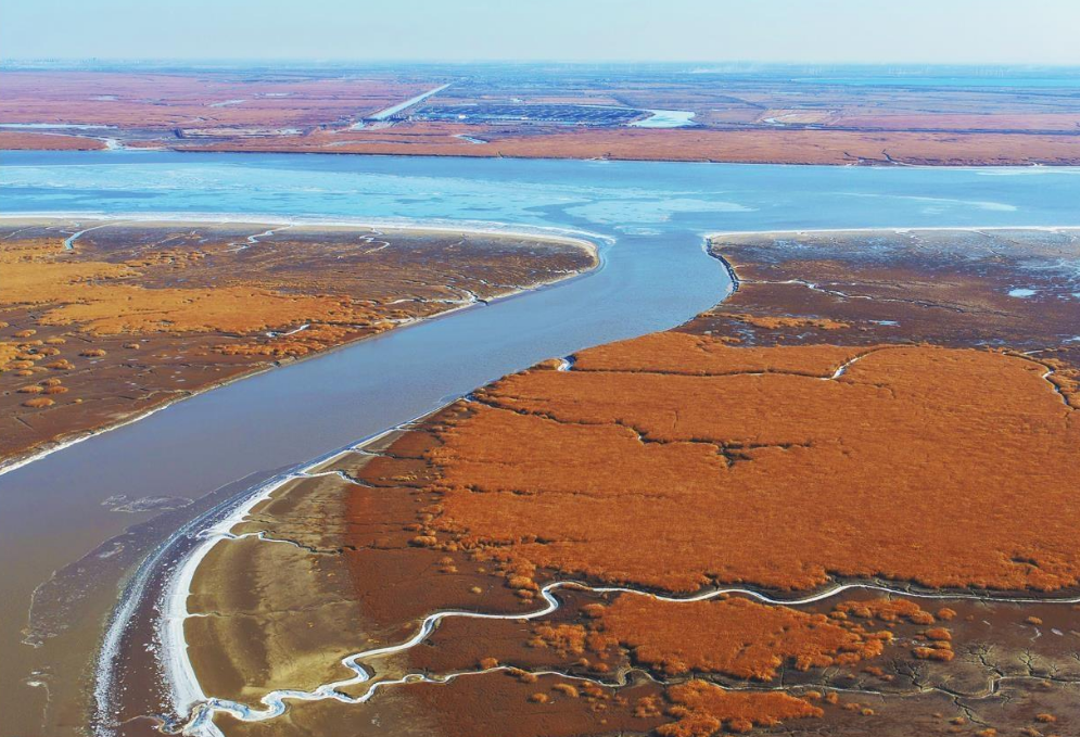 12月4日,盘锦辽河入海口湿地呈现一幅壮美的冬日画卷。随着气温持续走低,河水开始封冻,蜿蜒曲折的河道冰面宛若镶嵌在广袤滩涂上的玉带。从高空俯瞰,连绵无际的芦苇荡呈现深黄与金褐交织的温暖色调,随风起伏如波涛涌动。
