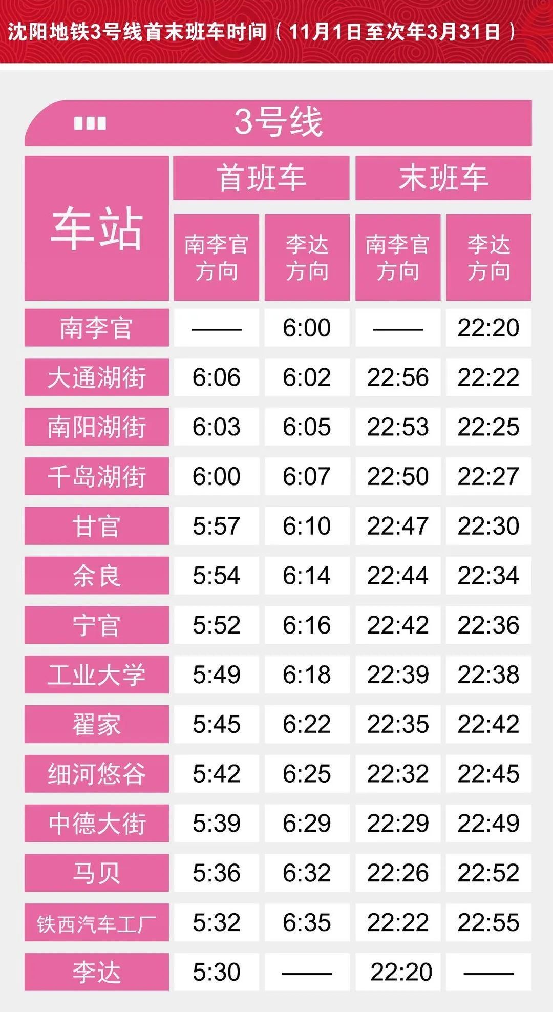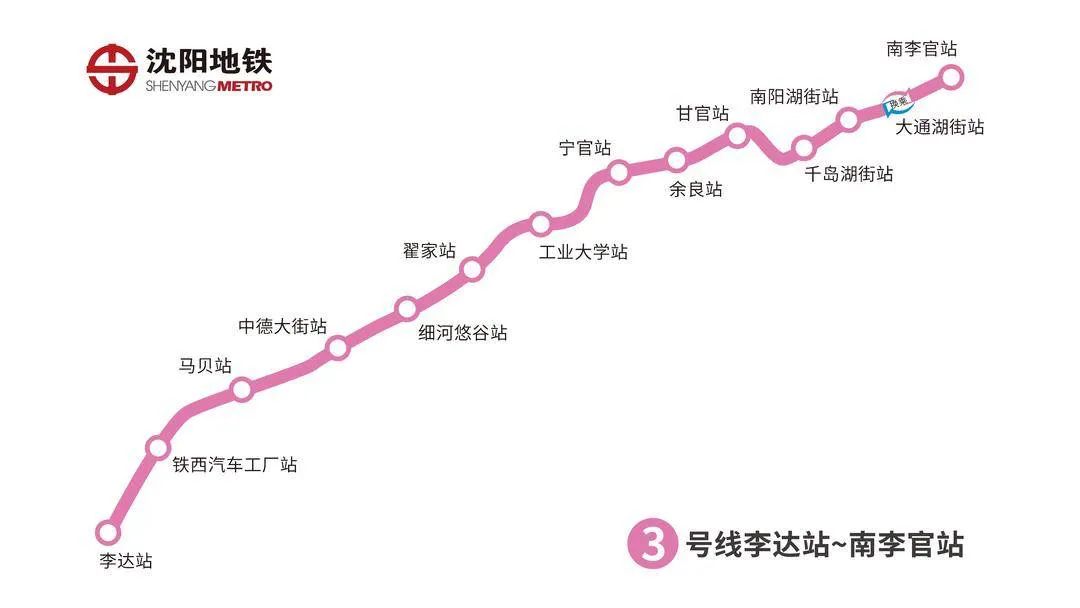 据了解,3号线李达站至南李官站为沈阳建成运营的第6条地铁线路,是沈阳地铁首条含有高架车站的线路,被市民形象地称为“空中地铁”。线路全长23公里,设车站14座,自西向东分别为:李达站、铁西汽车工厂站、马贝站、中德大街站、细河悠谷站、翟家站、工业大学站、宁官站、余良站、甘官站、千岛湖街站、南阳湖街站、大通湖街站、南李官站。其中,李达站至余良站9站为高架站,甘官站至南李官站5站为地下站,在大通湖街站与既有9号线换乘。