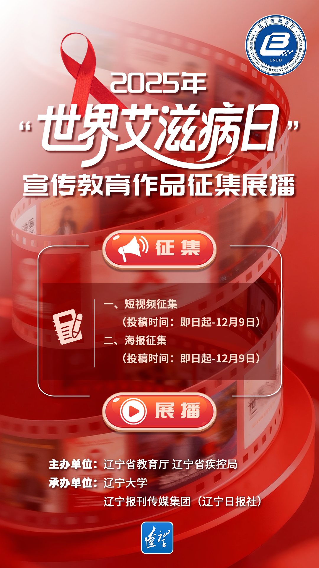 艾滋病是严重危害人类健康的重大传染病,青年学生群体是艾滋病防控的重点人群。为积极响应国家号召,践行疾控防治把关前移,立足高校学生群体,充分利用主流媒体影响力及传播优势,创新艾滋病宣传教育方式,于2025年12月1日第38个“世界艾滋病日”到来之际,由辽宁省教育厅、辽宁省疾控局联合主办,辽宁大学、辽宁报刊传媒集团(辽宁日报社)承办的“世界艾滋病日”宣传教育作品征集活动,今日正式向全省高校学子启动啦!
