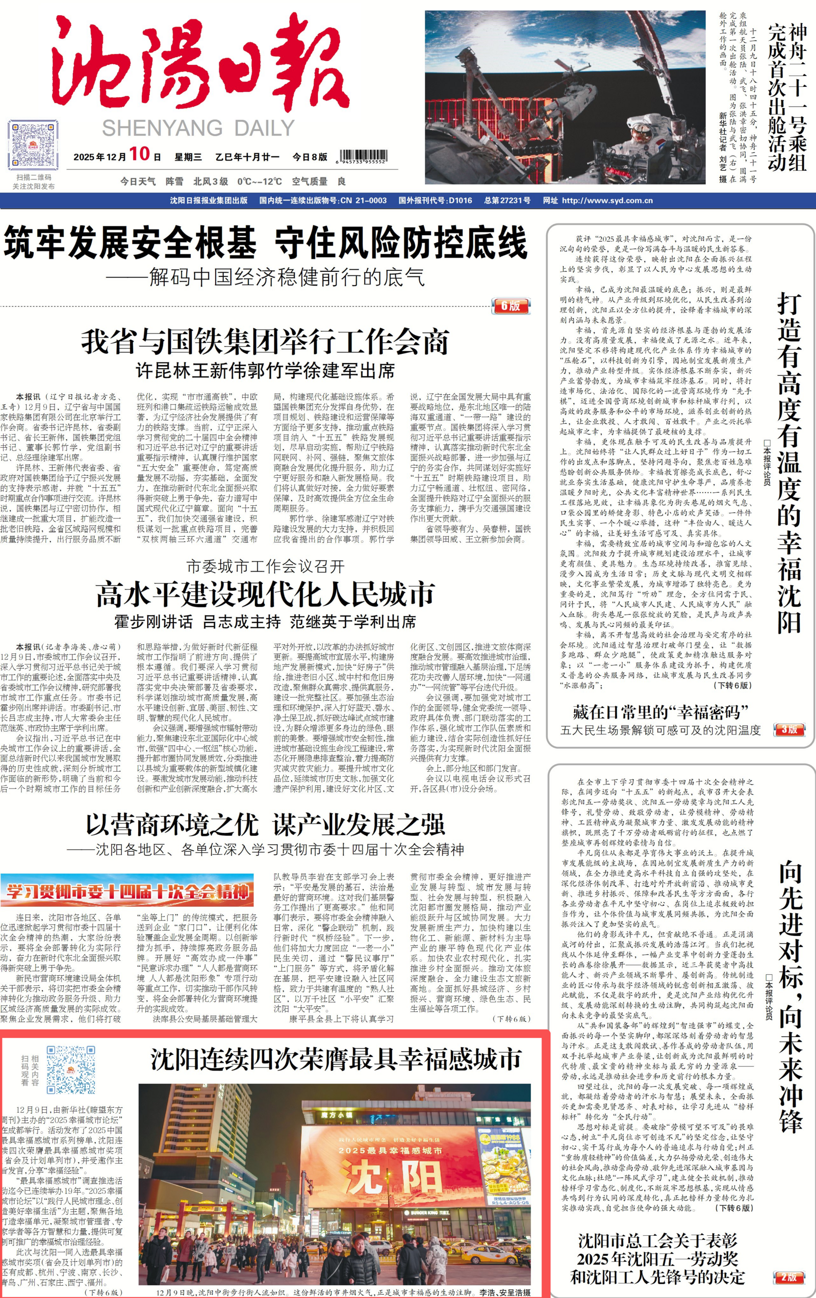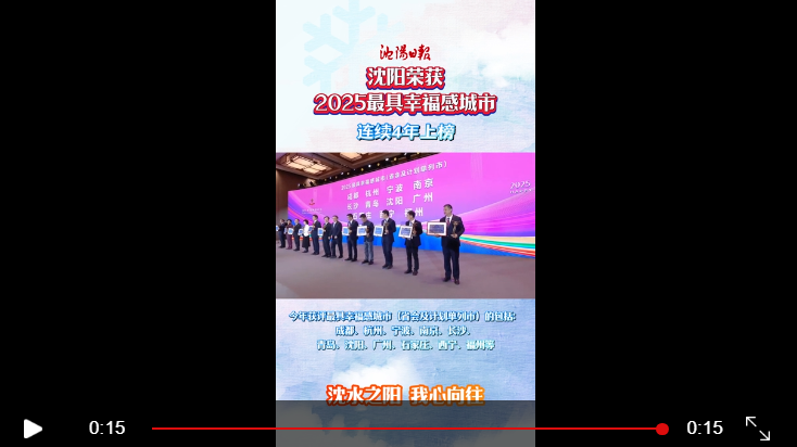 12月9日,由新华社《瞭望东方周刊》主办的“2025幸福城市论坛”在成都举行,活动发布了2025中国最具幸福感城市系列榜单,沈阳再次上榜,连续四次荣膺最具幸福感城市奖项(省会及计划单列市)。作为连续四年蝉联“最具幸福感城市”的东北代表,沈阳在论坛上受邀作主旨发言,分享沈阳的“幸福经验”。