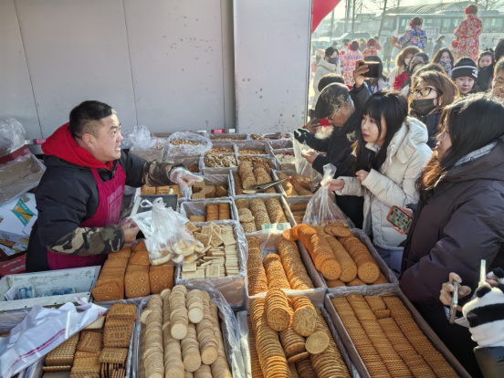 走在集市里,人流涌动,摩肩接踵,商品琳琅满目,叫卖声此起彼伏,网红商户“饼干小哥”“羊汤小哥”“打糕哥”“糖葫芦小哥”纷纷亮相,各具特色的小吃热气腾腾,香气扑鼻,一幅充满生活气息的东北赶集画卷生动展现。