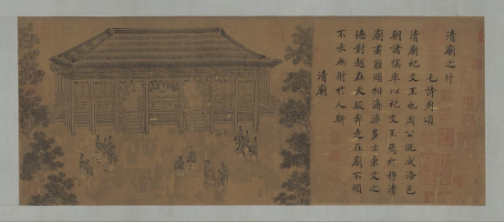 著名《毛诗图》之一南宋高宗书马和之画《周颂清庙之什图》,由宋高宗赵构题写《诗经》原文,著名宫廷画家马和之依据诗意绘制,诗画合璧。