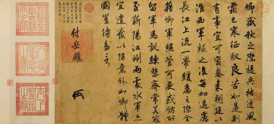 宋高宗还有一件《赐岳飞手敕》的行书作品,记录了他与抗金名将岳飞的交流。此作品楷书带行体,虽是在军事急迫中对属下的敕书,但点画讲究,姿态优美,行气首尾一贯,显现出很高的艺术造诣。从文词中可见当时宋高宗把岳飞视为心腹股肱,信任有加,并嘉勉其恭忠体国。后来,形势变化,岳飞事业成空,冤死狱中,后来者再读此件手敕,不禁产生一番感叹。