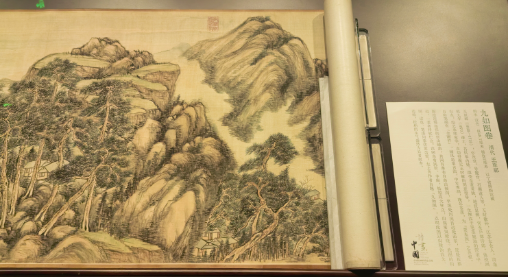 《九如图卷》是一幅山水长卷,设色笔法均模仿元代画家黄公望。左上角为作者自题九如图,点明此图借山陵高大连绵和松柏的生机盎然为长者祝寿。